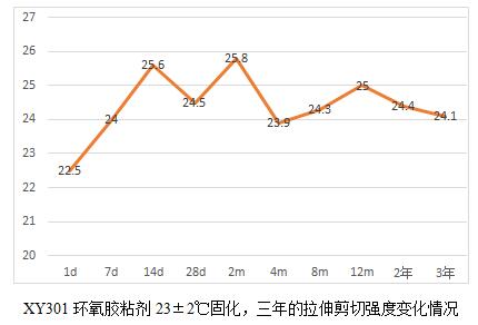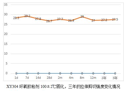 當(dāng)然通過這6個表,我們也能看出規(guī)律就是,膠粘劑產(chǎn)品高溫固化相對較為完全,后續(xù)老化數(shù)據(jù)影響不大,而常溫固化數(shù)據(jù)明顯低于高溫固化,比如XY304,常溫固化數(shù)據(jù)未25兆帕,高溫固化為28.3兆帕,而XY301室溫固化數(shù)據(jù)22.5兆帕,高溫固化為28.2,相比高出25%。