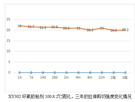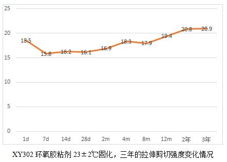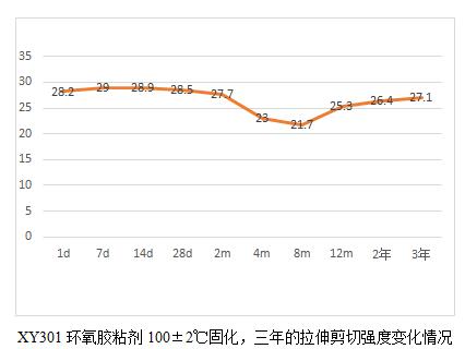 當(dāng)然通過這6個表,我們也能看出規(guī)律就是,膠粘劑產(chǎn)品高溫固化相對較為完全,后續(xù)老化數(shù)據(jù)影響不大,而常溫固化數(shù)據(jù)明顯低于高溫固化,比如XY304,常溫固化數(shù)據(jù)未25兆帕,高溫固化為28.3兆帕,而XY301室溫固化數(shù)據(jù)22.5兆帕,高溫固化為28.2,相比高出25%。